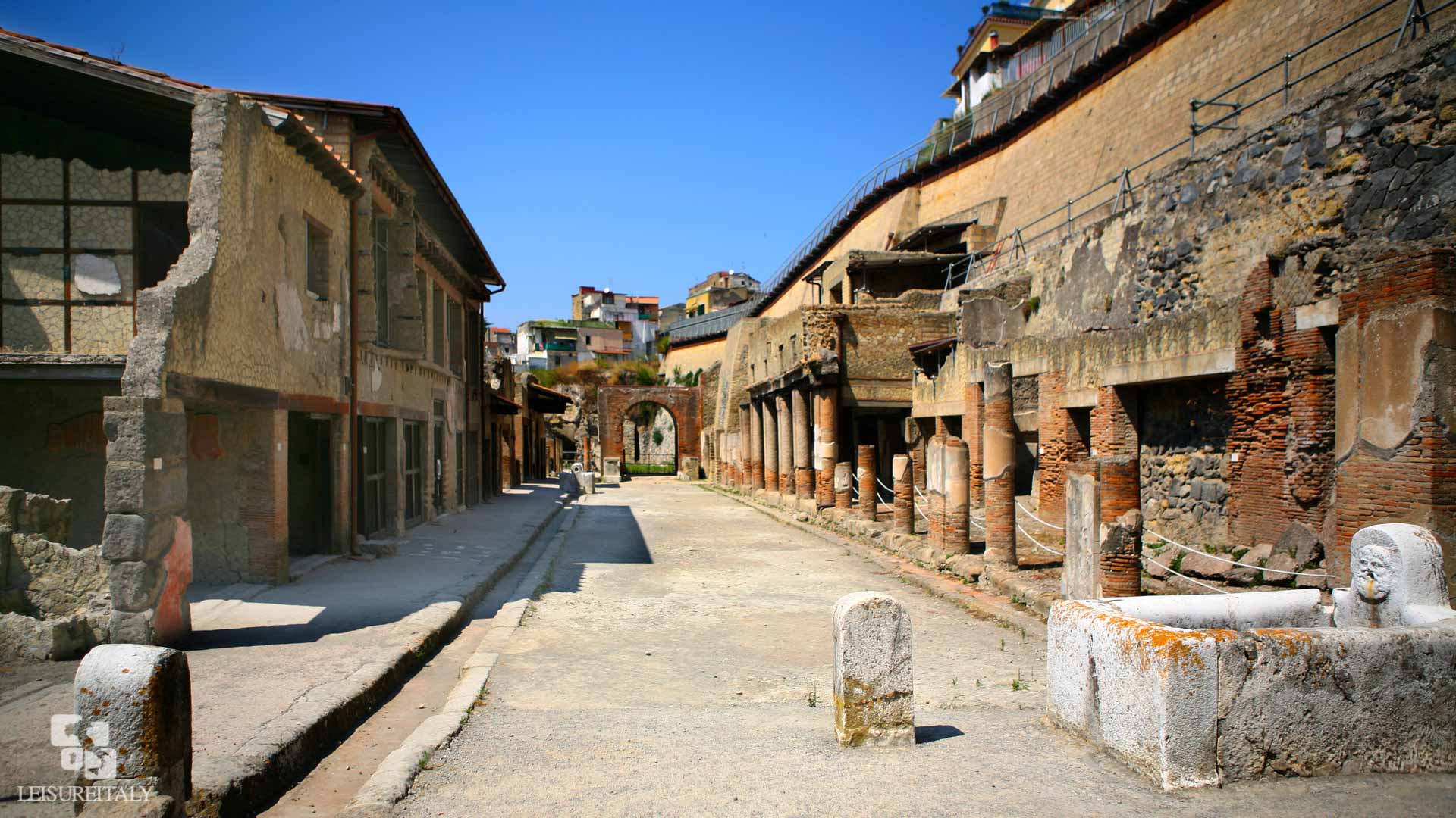 The first approach is spectacular: the ancient town sits at the bottom of an archaeological hole about 60 feet deep. From the top, you can see the entire excavated area at once, dominated by the impressive silhouette of Mt. Vesuvius in the background: a stunning view and a great photo opportunity!